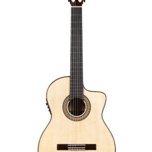 Acoustic electric cutaway version of the Katoh KF flamenco. This guitar’s combination of solid spruce top and agathis back and sides match up as a perfect combination for the aspiring flamenco player. Tone is great as it cuts through without compromising the bass register. The KF is designed and built to sound great whilst withstanding the rigours of robust flamenco playing. Cutaway gives excellent access to higher frets.
